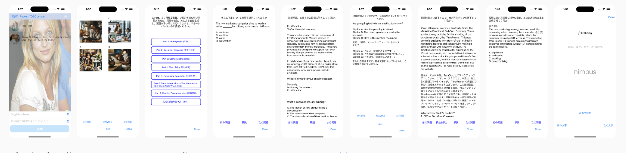 AI英会話チャットはTOEICの各パートの練習問題をそれぞれ30問程度、頻出単語を1000語以上収録しました。